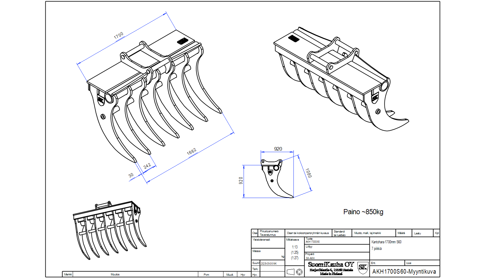 Mitat 620 x 1710 x 1280 mm (syvyys x leveys x korkeus)